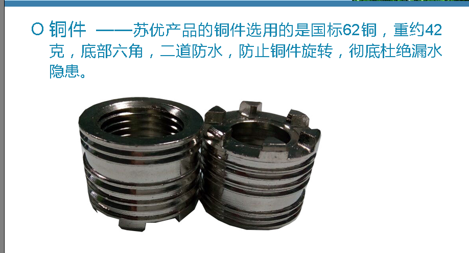 3、“凹”型的防伪标志,能够更好的解决客户的所有顾虑和利益保障。外观方面,一般厂家采用的模具只有些2000——3000元左右的模具,而苏优采用的是10000元一幅的模具,表面采用德国电解技术加上先进的设备和制造工艺。 4、铜件采用的是国标致59—1铜,铜重约62克,正常使用下绝不会开,二道防水,铜件底部六角,防止铜件旋转。避免漏水隐患。