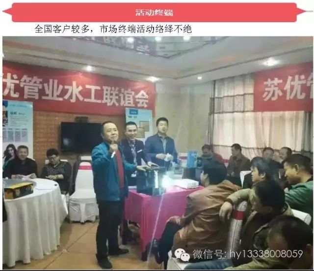 5、为了给代理商招商引资,会协助代理商举办各种品牌产品推广会和水工会,吸引更多的潜在客户变为真正客户。
